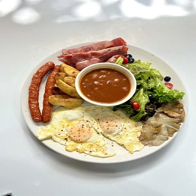 تخم مرغ 2عدد ،قارچ، لوبيا، بيکن، سيب زميني کريسپي، سالاد کاهو، چوريتسو 2 عدد، چاي