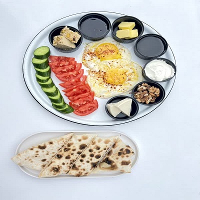 پنير، گردو، کره ،مربا ،خامه ،عسل ،تخم مرغ نيمرو2 عدد، گوجه، خيار، چاي