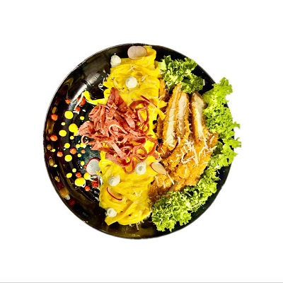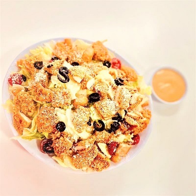 شنيتسل سوخاري300گرم ، کاهو پيچ ، نان کروتانز ،گوجه چري، زيتون ، سس سزار ، پنير پارمسان \\
