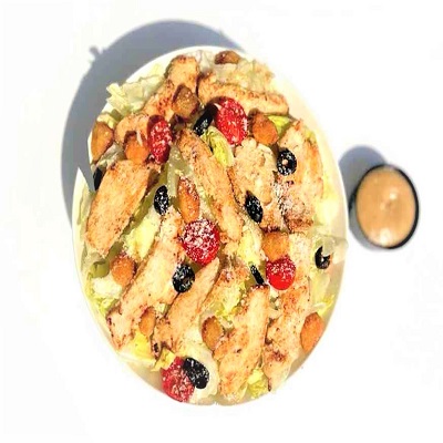 شنيتسل مرغ 300 گرم ، کاهو پيچ ، سس سزار ، نان کروتانز ،پارمسان ،گوجه چري ، زيتون