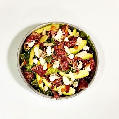 بيکن اسموکي ، کاهو فرانسه ،بازليکو ،آووکادو ،دات پنير مزه دار ،دات پوره هويج ،بادام پرک \\