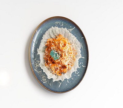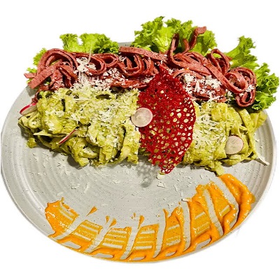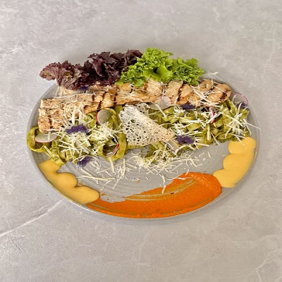 فتوچينه، پارمسان، پنير بلو چيز، سس پستو، شنيتسل گريل 200 گرم