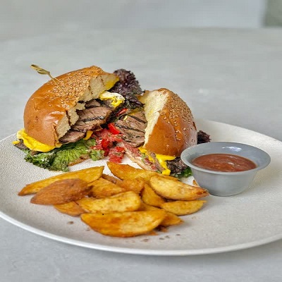 برگر 200 گرمي ، فيله گوساله ، پنير مزه دار شده ، کاهو فرانسه ، سالسا گوجه ، پياز کاراملايز ، قارچ ، پنير بلوچيز ، سس زرشک ، سيب کريسپي