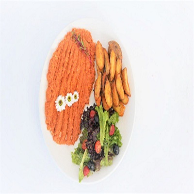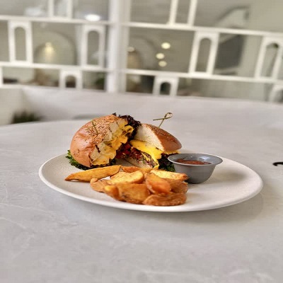 برگر 200 گرمي ، پنير مزه دار شده ، کاهو فرانسه ، سالسا گوجه ، پياز کاراملايز ، چيپس ، کدو ،بازليکو ، سس پستو ،سيب کريسپي \\