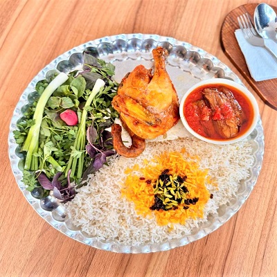 نيم مرغ اکبر جوجه اي ، سس گوجه بادمجان ، دورچين