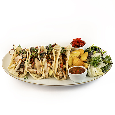فيله مرغ+نان تورتيلا+سس مخصوص+سيب زميني+دورچين....
